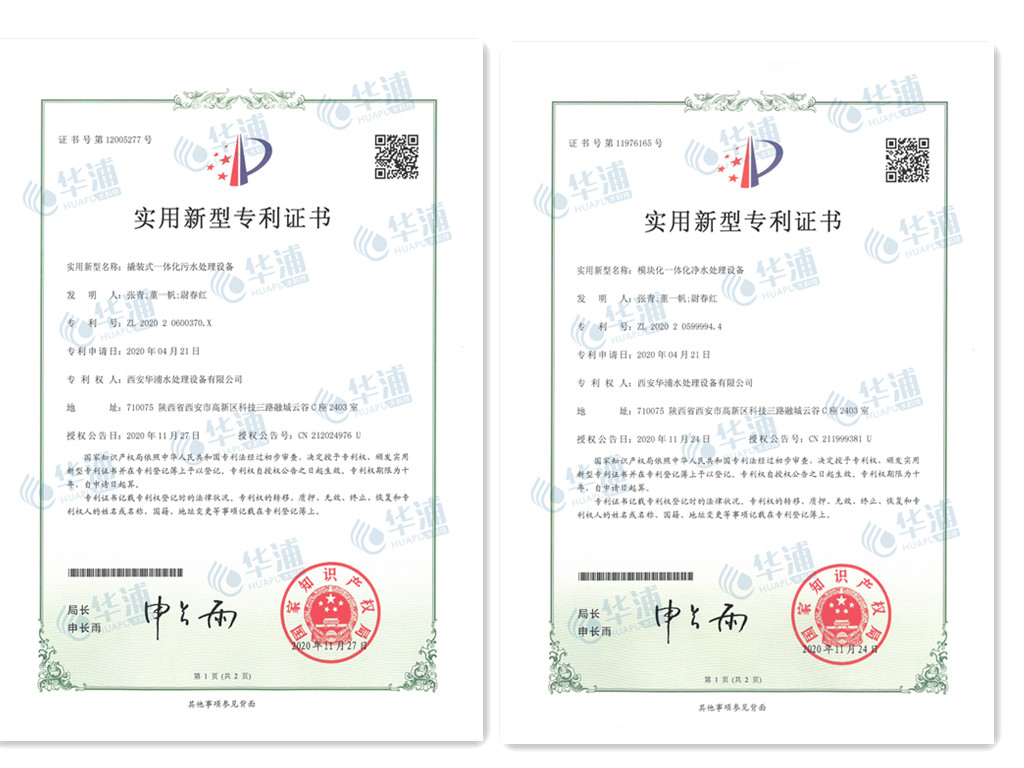 近日,華浦水科技自主研發(fā)的“撬裝式一體化凈水處理設備”和“模塊化一體化污水處理設備”兩項裝置獲得了國家知識產(chǎn)權實用新型專利。